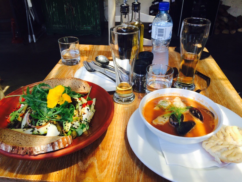 Abbiamo seguito le guide per trovare un posto dove pranzare, Fisherman’s Cottage, perfetto. Abbiamo imparato un’altra lezione: mai ordinare piú di un piatto sopratutto dopo 50 km di pedalata, le portate sudafricane sono il triplo delle nostre.