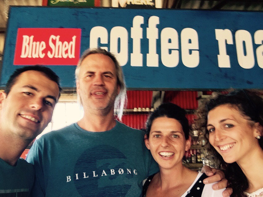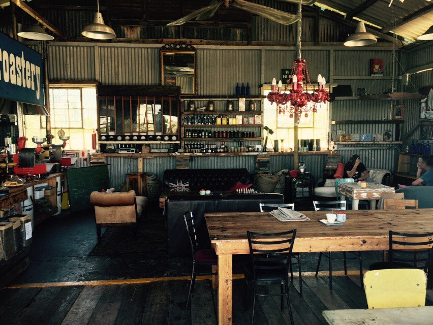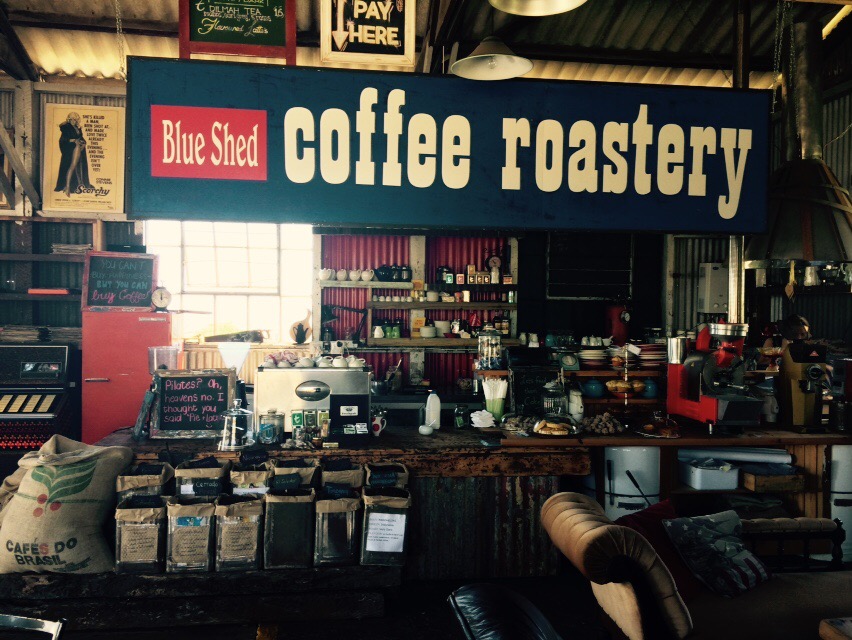 Entriamo nel “blue shed coffee roastery”, un capannone adattato a bar, sacchi di caffe per poter scegliere direttamente i chicchi del proprio espresso, spezie, torte ed un arredamento folle tra eliche di aerei e mobili in legno, quel misto tra usato e stile industriale che sembra una accozzaglia ma in realtà se lo guardi bene é studiato nei minimi dettagli ed é una figata.