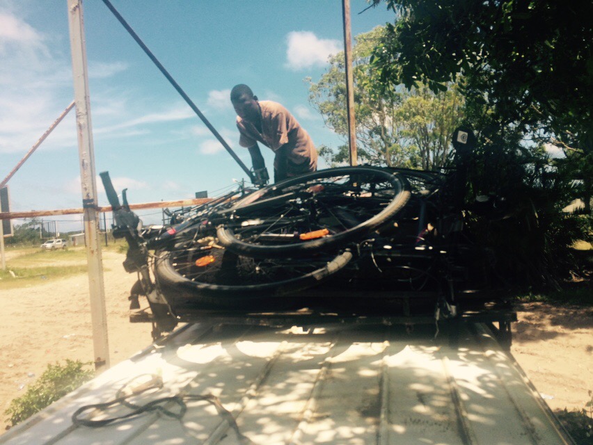 Iniziamo in mattinata con 40 gradi all’ombra e due bici da spingere nella sabbia, cercando un passaggio verso la frontiera, si perche dobbiamo tornare indietro eda li cercare un altro passaggio per Maputo: piu difficile di una tappa da 200 km.