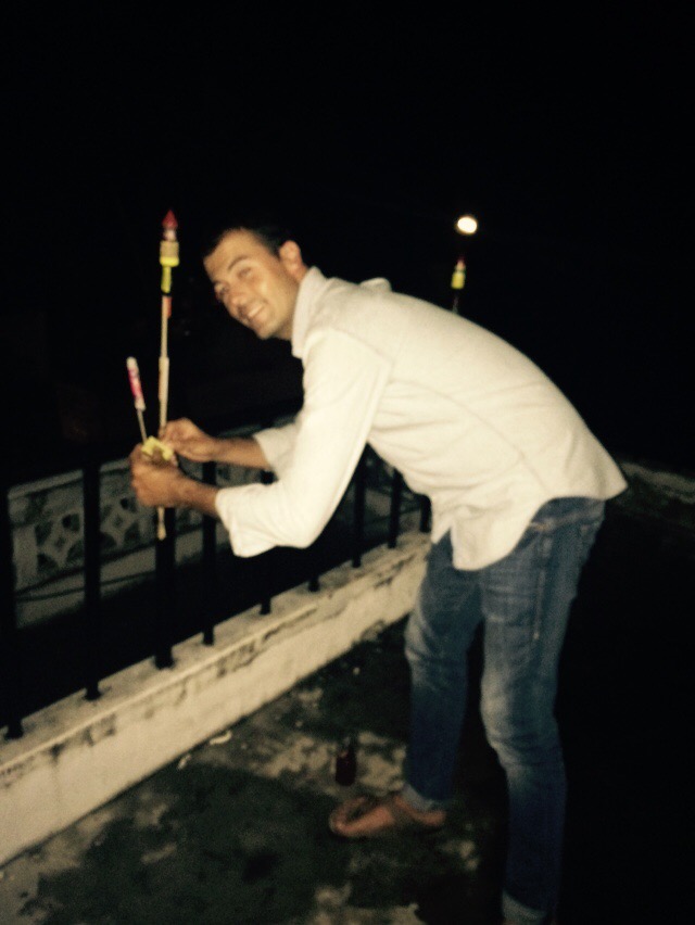 Una delle cose piu pericolose fatte in questo viaggio, ha posizionato i fuochi legandoli alla ringhiera, senza capire neanche dopo suggerimento, che lengandoli non sarebbero mai partiti il risultato é stato tragi/comico.