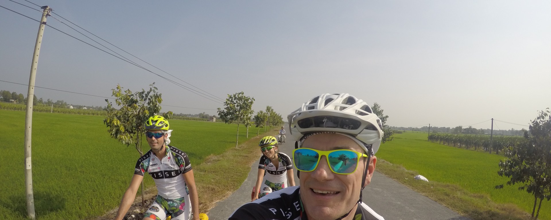 Ma torniamo alla strada. Tutte le informazioni dicevano che su TUTTI i punti di confine del Vietnam emettono visto per la Cambogia, forti di queste informazioni e memori della giornata prima e dell’errore di percorso abbiamo mantenuto l’itinerario previsto fin dall’inizio. Ci sono due confini a distanza di 50 km ma con vari fiumi e canali nel mezzo. Comunque, cominciamo a pedalare, ci immergiamo in una strada spettacolare, piena di bananeti e frutteti, risaie (penserete: niente di nuovo beh, le stesse cose ma in forma diversa) complice l’assenza di colline in lontananza e complice l’alternarsi di strade strette e poche trafficate e strade larghe e caotiche ci siamo esaltati. Ma, ancora meglio, gli ultimi 20 km prima del confine.