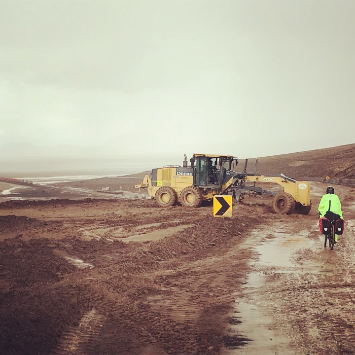 Il leggero dislivello e la presenza del montarozzo hanno comportato un cambio climatico. Improvvisamente più freddo, più acqua e la strada restrinta tra un pendio fangoso e dal facile cedimento ed un salar trasformatosi per le piogge in laguna fangosa.