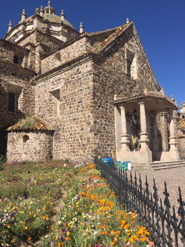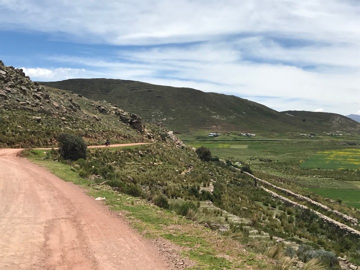 Dalla cima dei roccioni abbiamo iniziato una lunghissima discesa ed intorno a noi una piana alluvionale che circonda l’immenso Lago Titicaca. Davvero affascinante. Sole alto che brucia la pelle (siamo sempre e costantemente sopra i 3.800 metri s.l.m.) e verdi campi alternati da distese di quinoa o fiori gialli delle patate, prodotto nazionale per eccellenza.