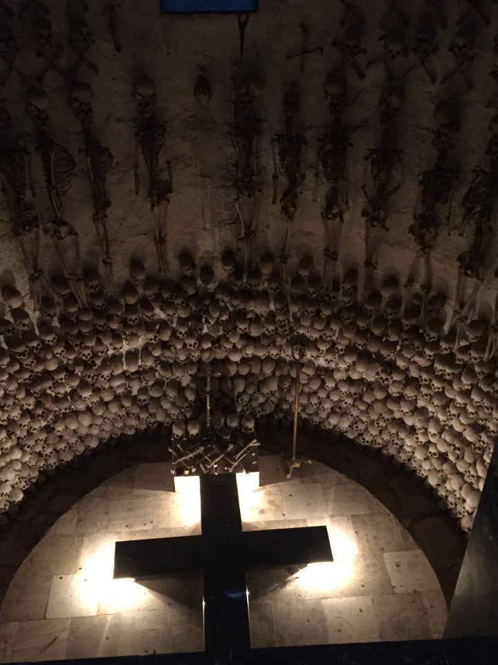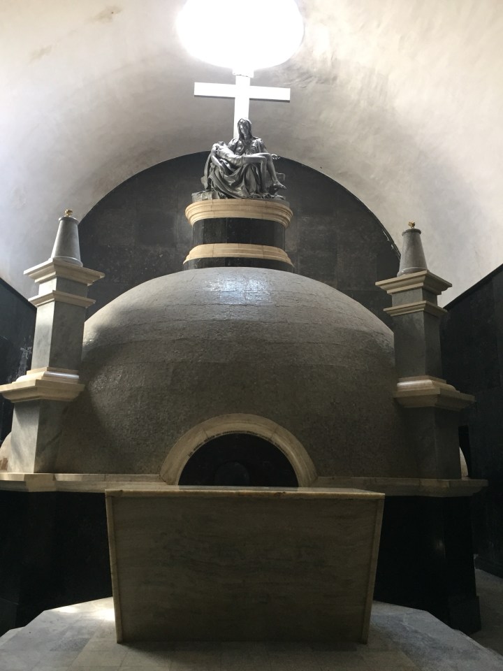 Ma le cosa più intriganti di questa Chiesa sono due, la prima è la Cappella della Pietà che, udite udite, si chiama così perché al suo interno ha una copia in pietra della Pietà di Michelangelo. Praticamente entrando in una area della chiesa al lato della navata, si entra in una stanza molto ampia in cui tutto lo spazio risulta occupato da una costruzione in marmo di Carrara di forma cilindrica coperto con una cupola con un mosaico di marmo di Carrara e sormontato dalla copia della Pietà. Su un lato un altare al di dietro del quale, attraverso una finestra, si vede l’interno. L’interno è più profondo del pavimento di almeno 4 metri ed è ricoperto di scheletri e teschi su tutta la superficie, al di sotto e al di sopra della finestra. Avrei voluto avere una guida che mi dicesse di più su quella macabra decorazione della Cupola ma, per il momento, mi accontento di averla vista. La seconda cosa intrigante di questo edificio sono le pietre con cui è stata costruita ed i giardini in fiore che la circondano. Gli spagnoli hanno usato una tecnica costruttiva che si chiama Calicanto.